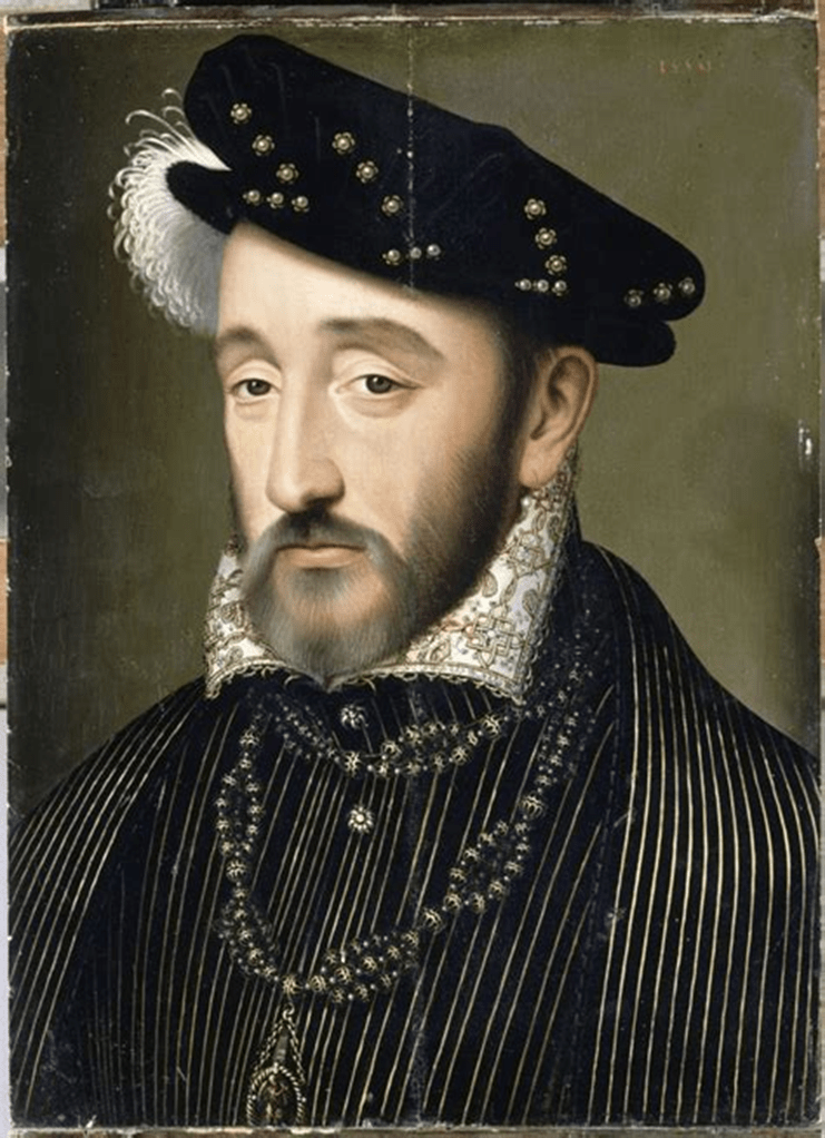 Le tourtereau. Portrait d’Henri II, roi de France (1519-1559), par François Clouet conservé à Florence (Palazzo Pitti, Inv. 3260). Le noir et le blanc étaient à la mode, ainsi que les bijoux, les diamants dans le chapeau plat, une sorte de béret. Une mode venue d’Italie et rapportée à la suite des guerres d’Italie menées par son père et lui-même.
