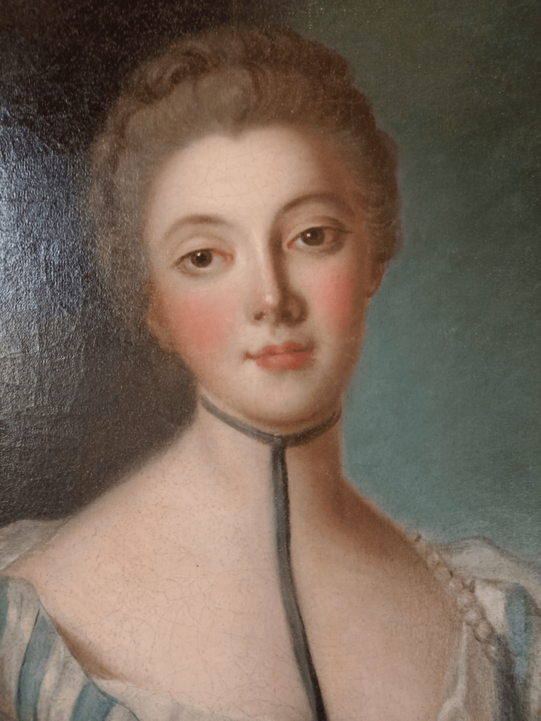 Et il y a bien air de famille avec le portrait de Louise Dupin, ici princesse de France sinon en grand appareil, du moins dans une robe éclatante chargée de volants, mais le même air de candeur et d’innocence. Mêmes lèvres rouges, mêmes joues rougies. Toutes pareilles.